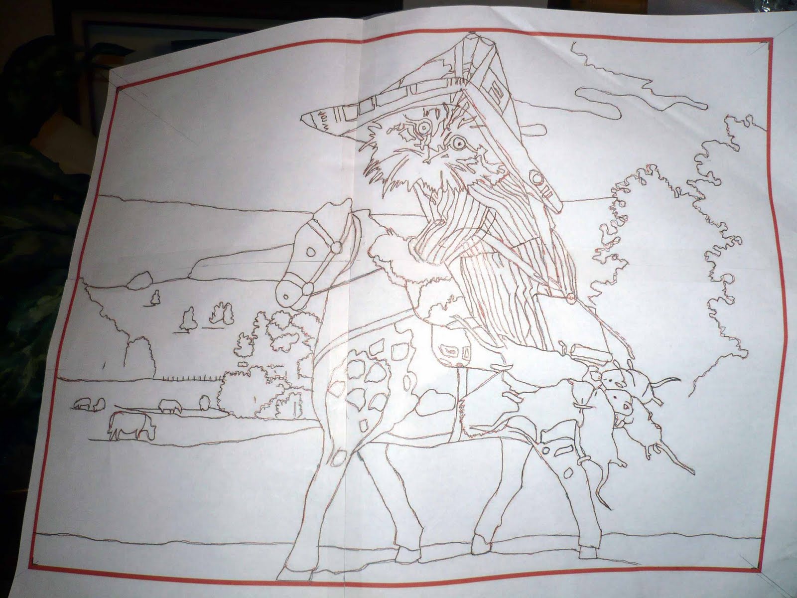 Doing my daughters nursery picture, (see earlier post), got me into the painting mood so I've started a new one. I took the sketch and enlarged it onto 8"x11.5" pages which I taped together to make the canvas size I wanted. Then I took transfer paper and traced the pattern onto my canvas and went over it with burnt umber to make my under sketch. Now I've got to let it dry and then do color toning. It feels good to smell the turpentine again and get messy.